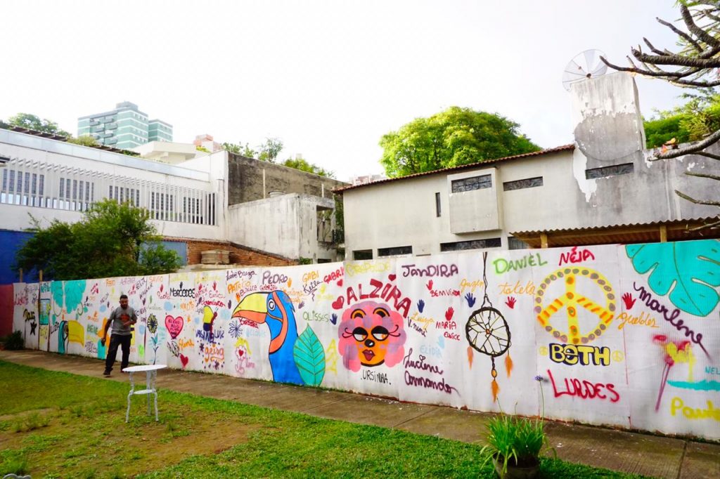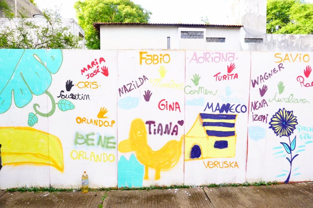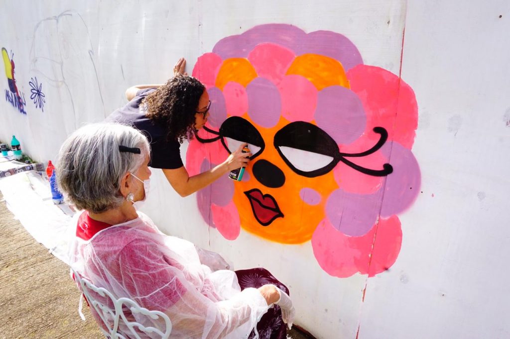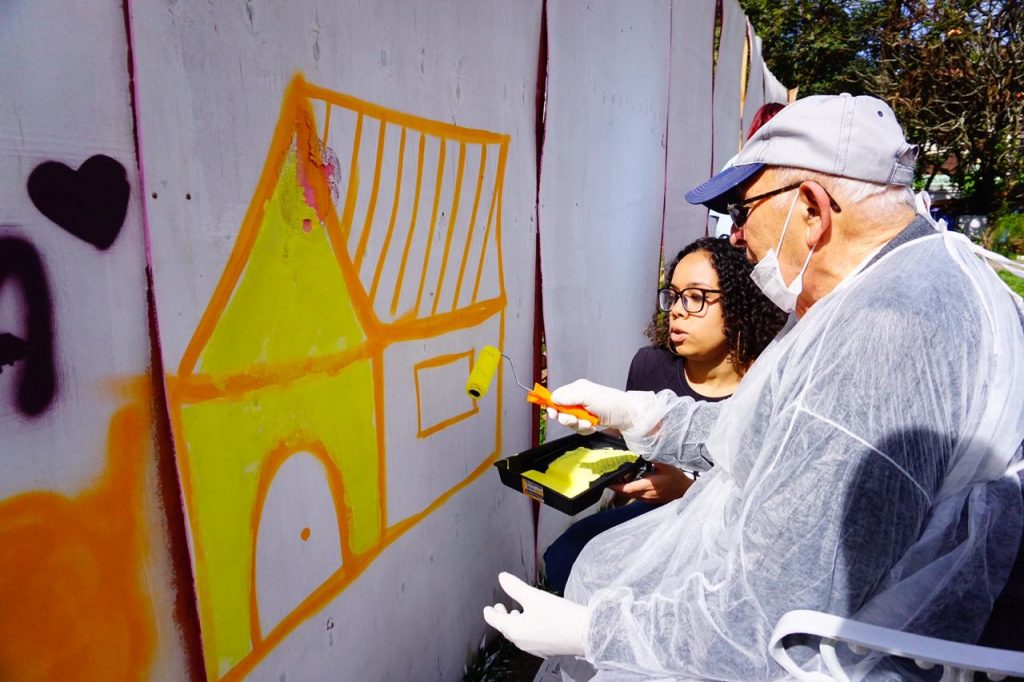 A recreacionista Aline Marques foi quem adaptou o projeto português à casa Residência Primaveras. No país europeu, os idosos fazem grafite nos muros e paredes das ruas públicas, mas em São Bernardo os 36 residentes, com idade entre 67 e 100 anos, transferiam seus desenhos e pinturas, feitos durante as atividades recreativas da casa, para uma parede de tapume. “Grafiteiros ajudaram a riscar alguns desenhos selecionados e nossos residentes pintaram. Alguns com o spray, outros com rolinhos, dependendo da mobilidade de cada um”, diz a funcionária. Ainda segundo ela, até os idosos com maior dificuldade de locomoção tiveram um pedacinho deles na arte. “Para os que não conseguem pintar, ajudamos a fazer um molde das mãos de cada um, como um carimbo.”